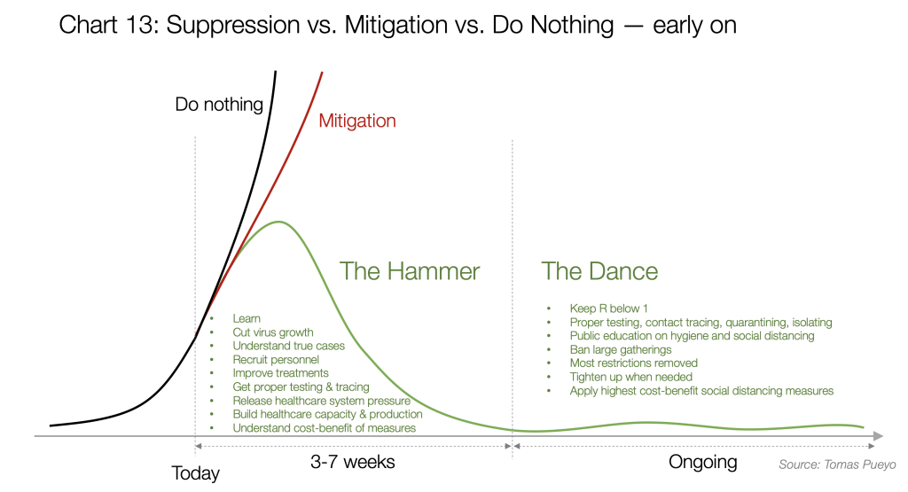 Here is a very interesting and informative piece on the implications of 3 approaches to how governments may choose to handle the coronavirus pandemic. As you can tell, most governments are trying to impose the Hammer.